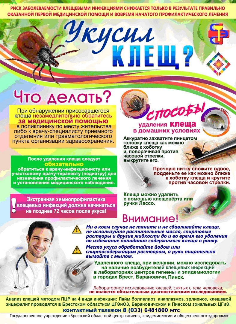Удаленного клеща, при желании, можно исследовать на наличие возбудителей 4-х инфекций: клещевого энцефалита, болезни Лайма, анаплазмоза, эрлихиоза методом ПЦР. На платной основе данный вид исследования проводится в Брестском областном центре гигиены, эпидемиологии и общественного здоровья, Барановичском зонЦГЭ и Пинском зонЦГЭ (адреса и время приема находятся в таблице ниже).