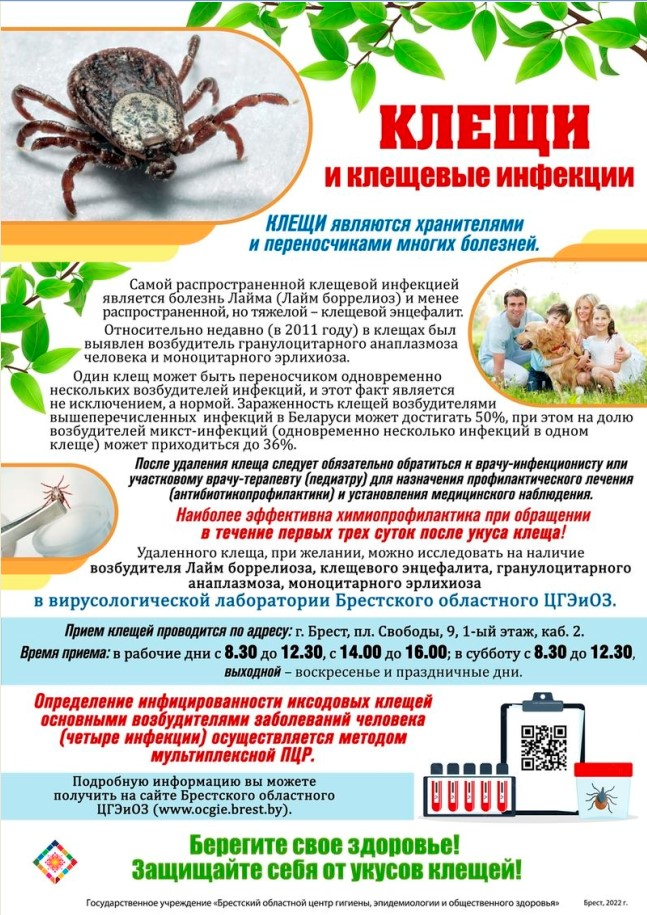 Прием клещей и выдача результатов осуществляется по адресу г.Брест, пл. Свободы, 9, 1-й этаж, тел. 8(0162) 53-25-17.