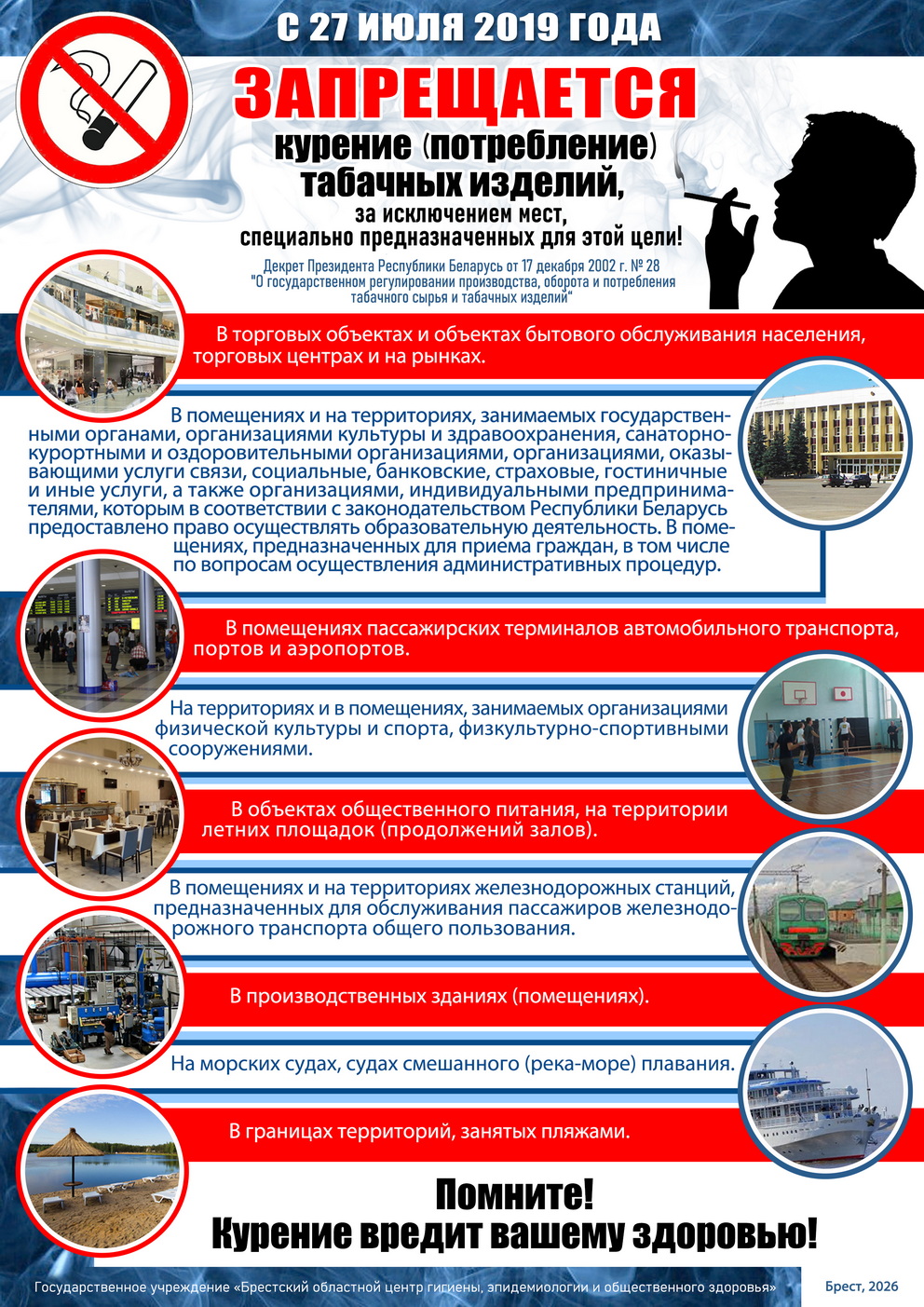 Одним из важных вопросов остается выполнение требований антитабачного законодательства в части запрета курения в местах, определенных Декретом Президента Республики Беларусь от 17.12.2002 № 28 «О государственном регулировании производства, оборота и потребления табачного сырья и табачных изделий».